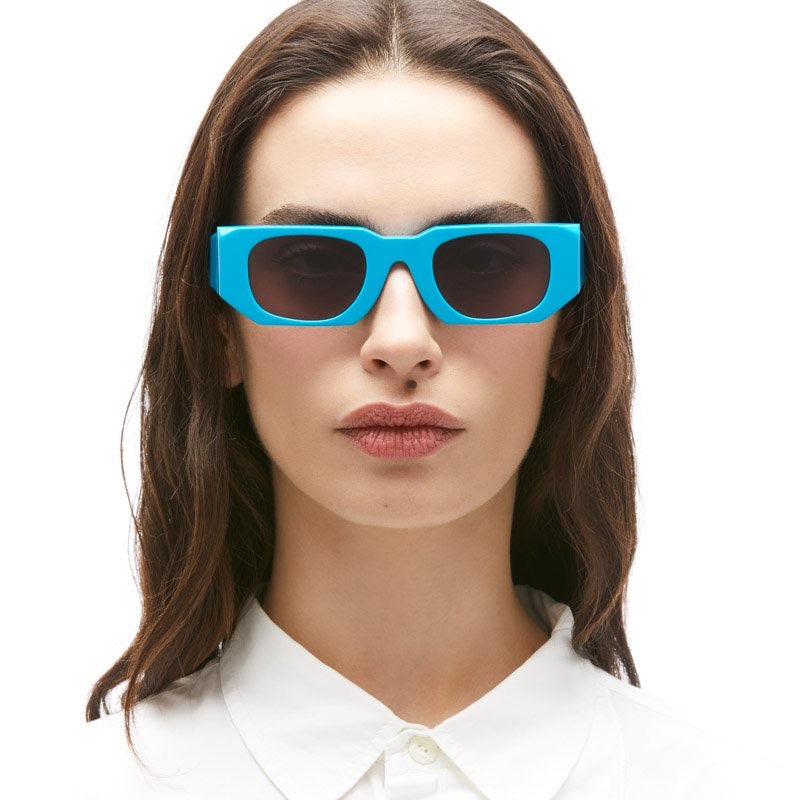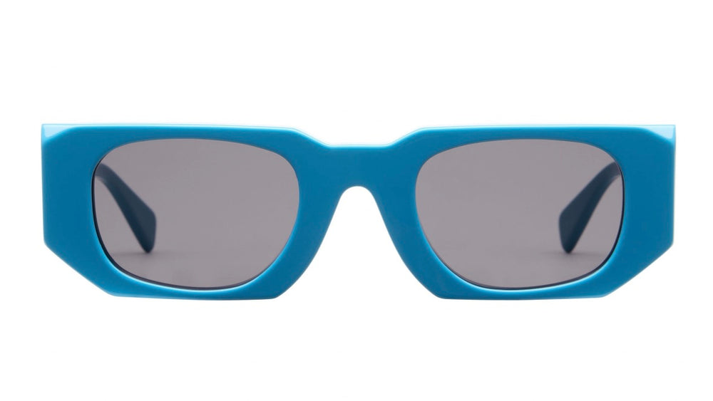 These are bold, chunky rectangular sunglasses with an architectural aesthetic. The frames feature a distinctive geometric shape with sharp angles and a substantial build. The vibrant turquoise blue color makes a striking statement, while the grey lenses provide a sophisticated contrast. The design has a contemporary, avant-garde feel with its oversized proportions and clean lines. The sunglasses have a uniform color treatment throughout, with matching temple arms that extend straight back. The thick construction suggests durability and makes a strong fashion statement.