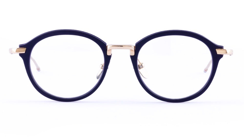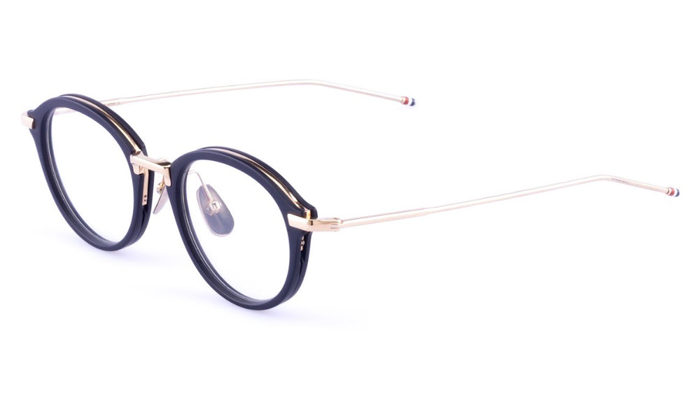 A sophisticated round-framed optical design featuring a black matte finish with luxurious gold accents on the bridge and temple arms. The frame showcases a perfect blend of classic and contemporary styling with its medium-thick rim and delicate nose pad system. The elegant combination of black and gold creates a professional yet fashionable look suitable for any formal or casual setting. The design demonstrates excellent craftsmanship with its precise detailing and balanced proportions.