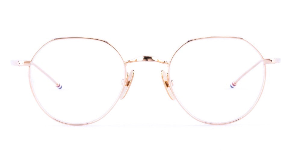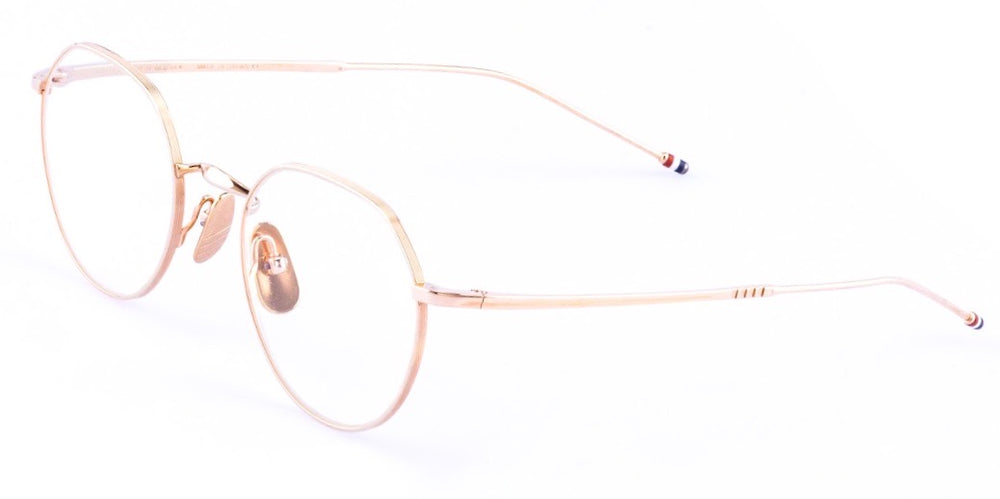 These are elegant round-framed glasses featuring a delicate gold-toned metal construction throughout. The frame has a classic, minimalist design with thin rims and temple arms. The round shape is perfectly symmetrical and features a refined nose bridge with adjustable nose pads. The overall aesthetic is sophisticated and timeless, suitable for both professional and casual wear. The frames exhibit excellent craftsmanship with smooth finishing and subtle detailing at the temple joints. The transparent lenses are housed within the thin metal rims, creating a lightweight and comfortable appearance.