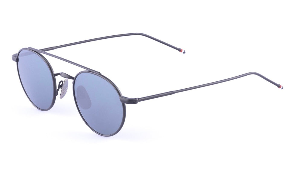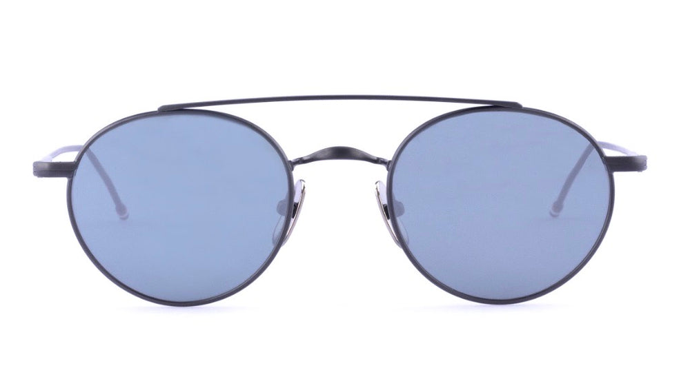Classic round metal sunglasses with a minimalist design featuring a sleek black frame and blue-tinted lenses. The design showcases a delicate double bridge construction and thin temple arms, creating a sophisticated vintage-inspired aesthetic. The frame demonstrates excellent craftsmanship with precise detailing and high-quality metal construction throughout. These sunglasses offer a timeless silhouette that balances retro charm with contemporary sophistication.