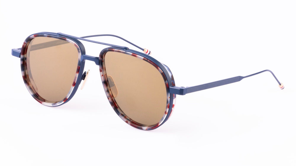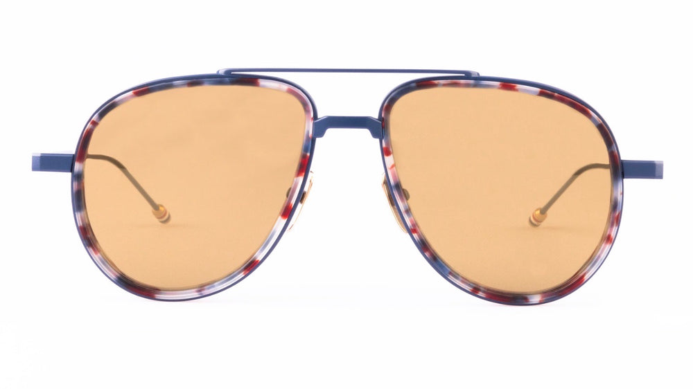 These Thom Browne aviator sunglasses feature a distinctive tortoiseshell acetate rim around metallic frames, creating an elegant contrast. The frame combines a navy blue metal structure with tortoise patterning in red and blue tones. The amber/brown-tinted lenses complement the frames vintage aesthetic. The design includes delicate nose pads and slim temple arms, embodying a sophisticated fusion of classic aviator style with contemporary luxury details.