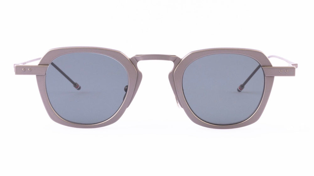These sophisticated Thom Browne sunglasses feature a distinctive geometric shape with clean angular lines. The sleek metallic bronze frame has a modern architectural quality with slim temple arms and minimalist design elements. The grey lenses are set within the angular metallic frames, creating a refined and contemporary aesthetic. The design showcases excellent craftsmanship with precise detailing and high-quality finishes typical of luxury eyewear.