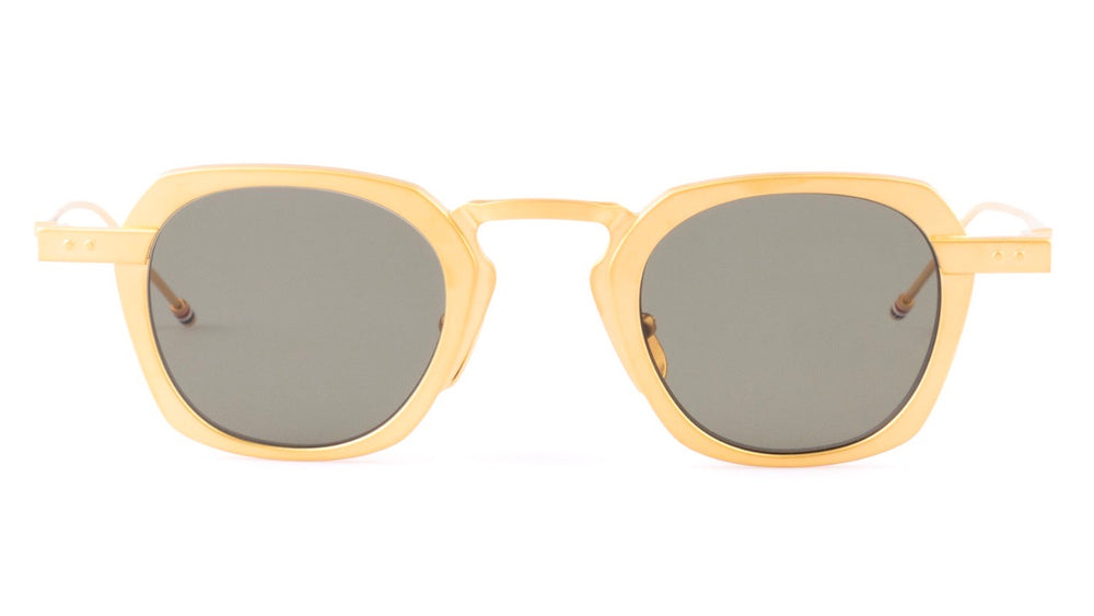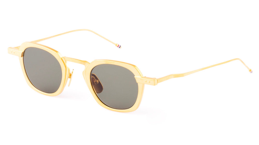These are sophisticated gold-tone geometric sunglasses with a distinctive architectural quality. The frames feature a structured, angular design with clean lines and a modern silhouette. The grey lenses are set within a medium-weight metallic frame that exhibits excellent craftsmanship. The sleek nose bridge and temples maintain the minimal aesthetic while providing durability. These sunglasses blend luxury with contemporary design, making them suitable for both formal and casual occasions. The proportions are well-balanced, creating a refined look that would complement various face shapes.