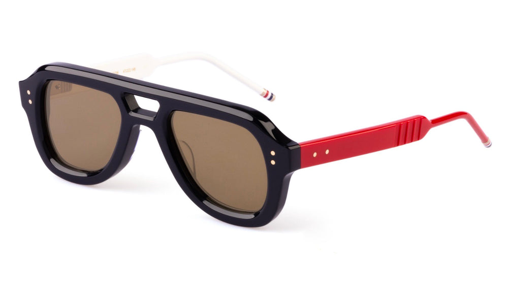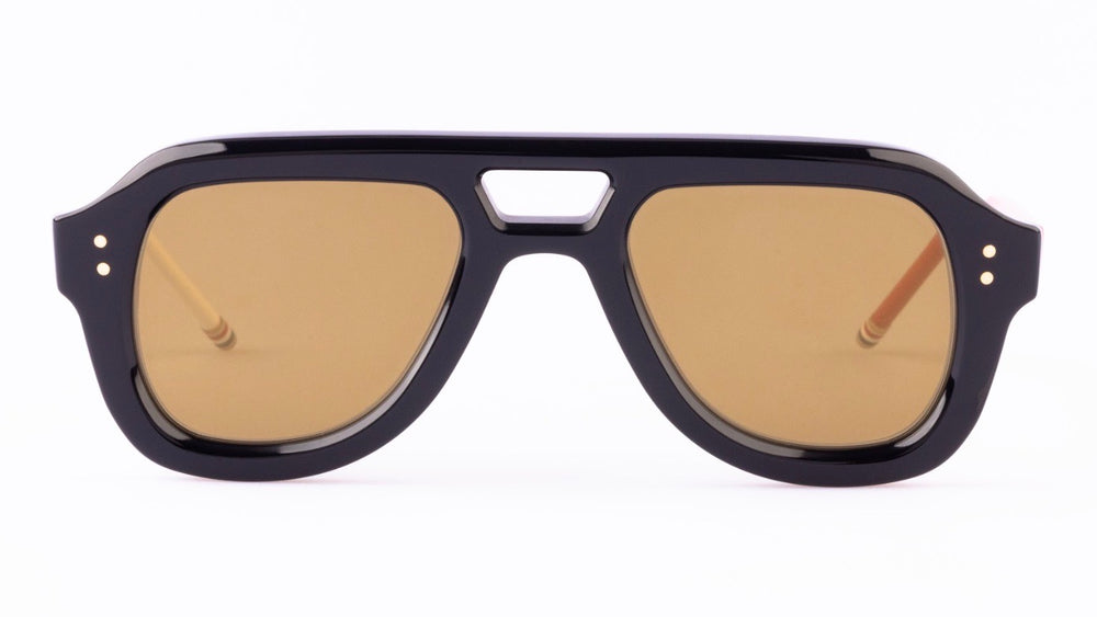 A sophisticated pair of aviator-style sunglasses with a bold, architectural design. The frames feature a distinctive thick black plastic construction with a modernized aviator silhouette. The bridge has a unique cut-out detail, adding a contemporary twist to the classic shape. The lenses are a warm bronze tint, complementing the strong black frame. Small signature metal dots are visible on the front corners, adding a subtle luxury detail. The overall aesthetic is both bold and refined, perfect for the fashion-forward individual seeking a statement piece with timeless appeal.