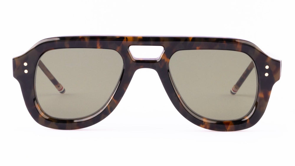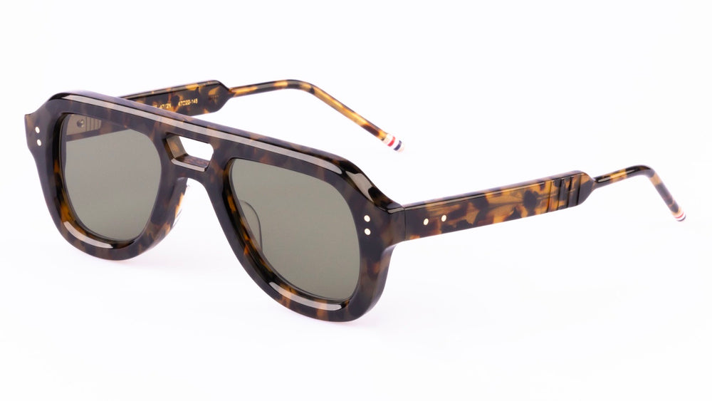 These are bold geometric-shaped sunglasses with a distinctive aviator-inspired design featuring a thick tortoiseshell acetate frame. The glasses showcase a unique architectural top bar and a prominent bridge design. The frame has a luxurious marbled tortoise pattern throughout, with grey-tinted lenses. The design incorporates subtle metallic details on the sides, creating a sophisticated and high-end aesthetic. The bold, oversized silhouette conveys a strong fashion statement while maintaining a classic appeal.