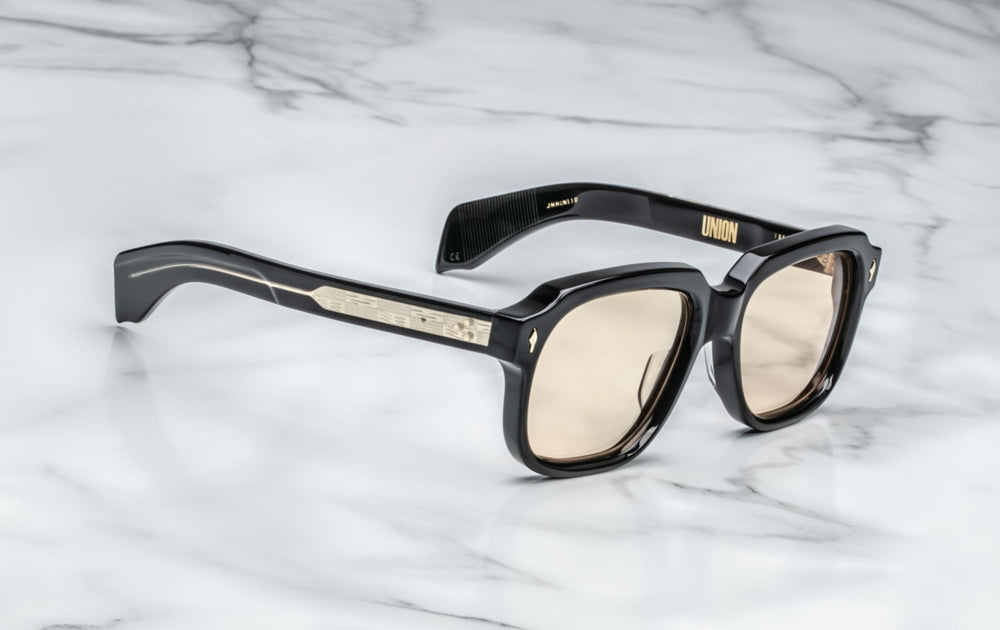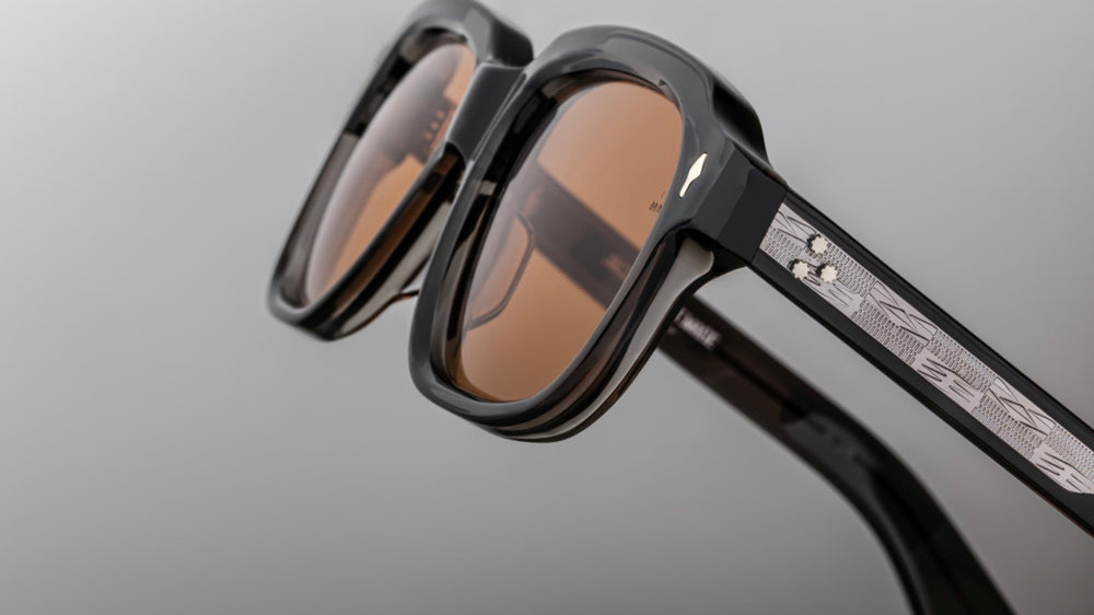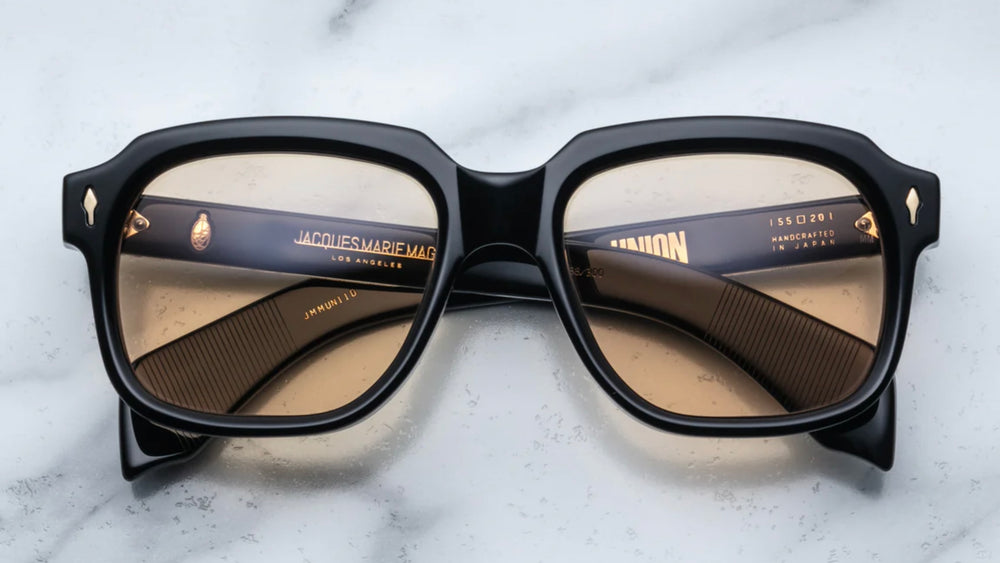 A sophisticated pair of handcrafted Japanese sunglasses from Jacques Marie Mage Los Angeles featuring a bold, thick-framed square design in matte black. The sunglasses showcase brown-tinted lenses and distinctive diamond-shaped accents at the temples. The substantial construction and oversized silhouette create a striking, luxury aesthetic with clean architectural lines. The frames have a vintage-inspired feel while maintaining a contemporary edge.