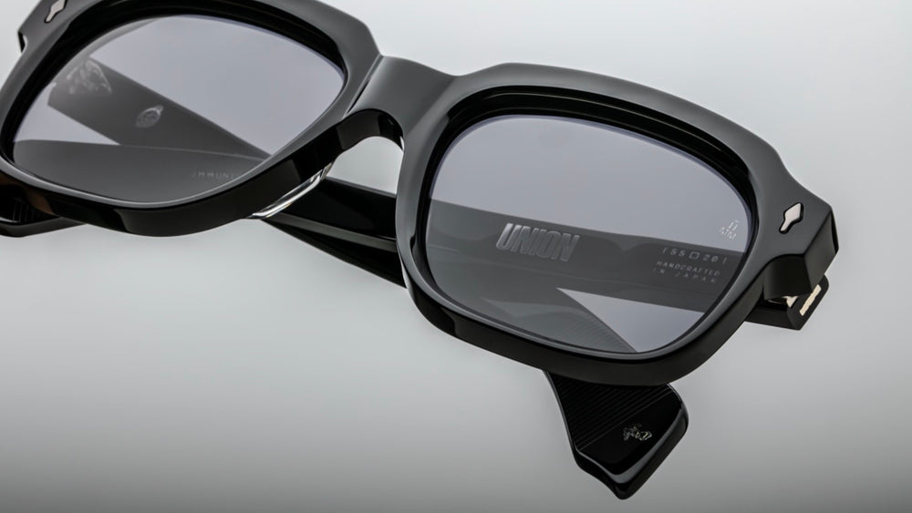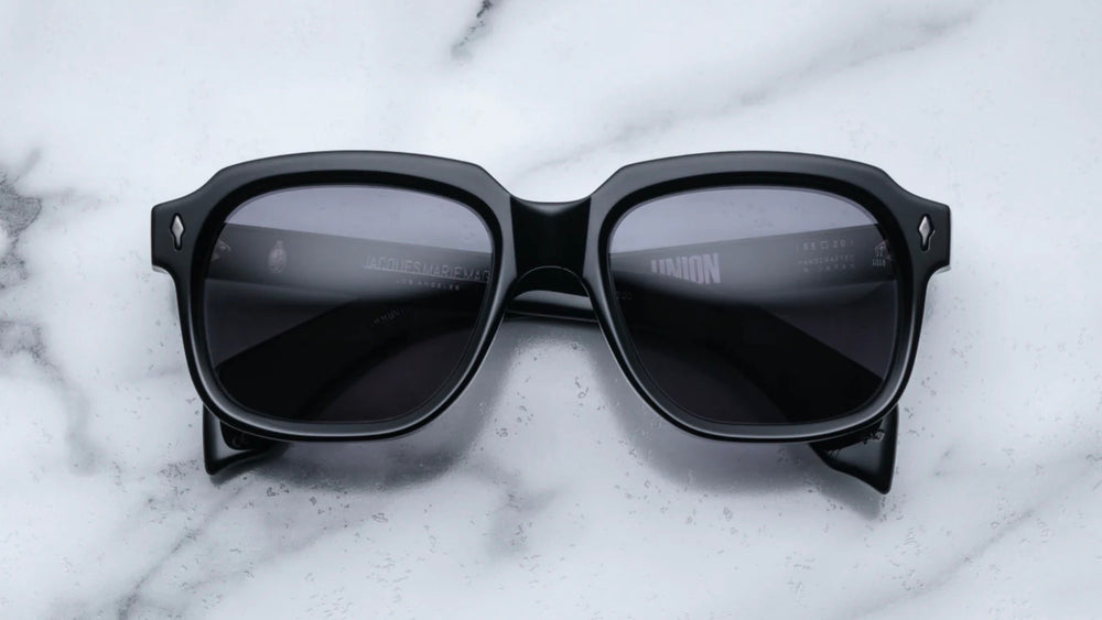 A sophisticated pair of bold, oversized square sunglasses from Jacques Marie Mage. The frames feature a chunky, architectural design with a glossy black finish and distinctive angular corners. The design showcases a minimalist yet luxurious aesthetic with clean lines and substantial temple arms. The dark lenses complement the frames bold presence, while the classic wayfarer-inspired silhouette maintains timeless appeal. The sunglasses appear to be expertly crafted with premium materials, emphasizing both style and durability.