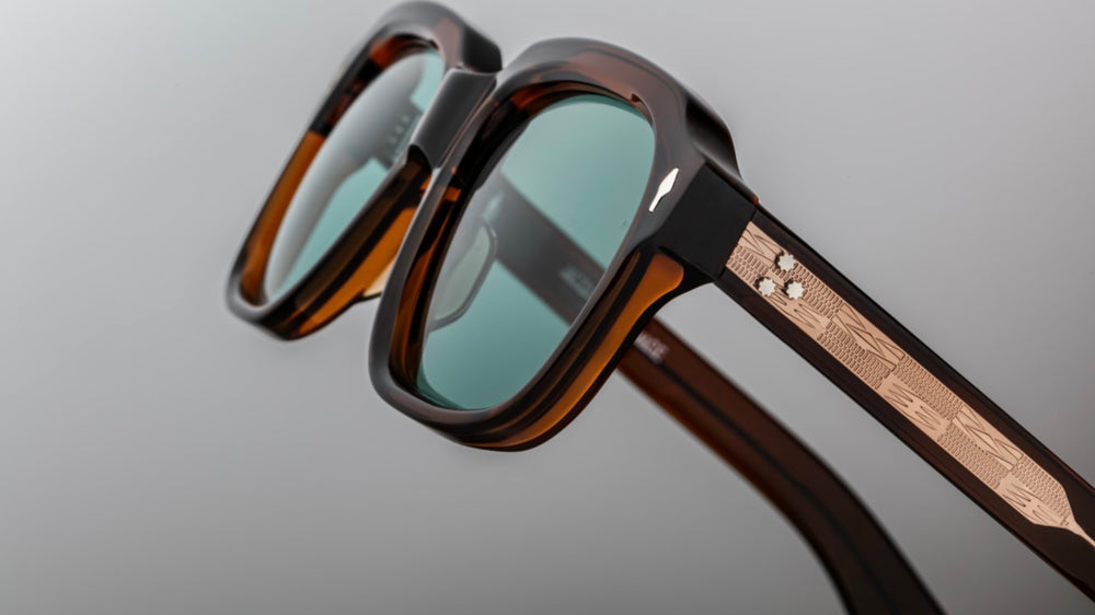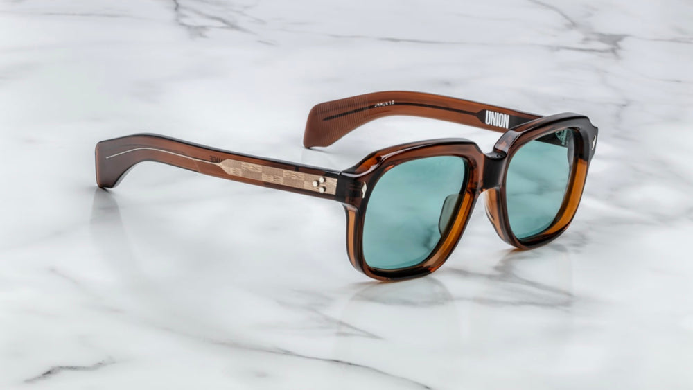 This is a sophisticated pair of Jacques Marie Mage sunglasses featuring a translucent brown acetate frame with a substantial square silhouette. The sunglasses showcase vintage-inspired design elements with modernized details. The lenses are a distinctive sea-green tint, and the frames have a luxurious transparency that catches light beautifully. The build quality appears premium with clean lines and geometric angles that create an intellectual, retro-contemporary aesthetic. The temple arms maintain the same translucent brown coloring as the front frame, creating a cohesive look throughout.