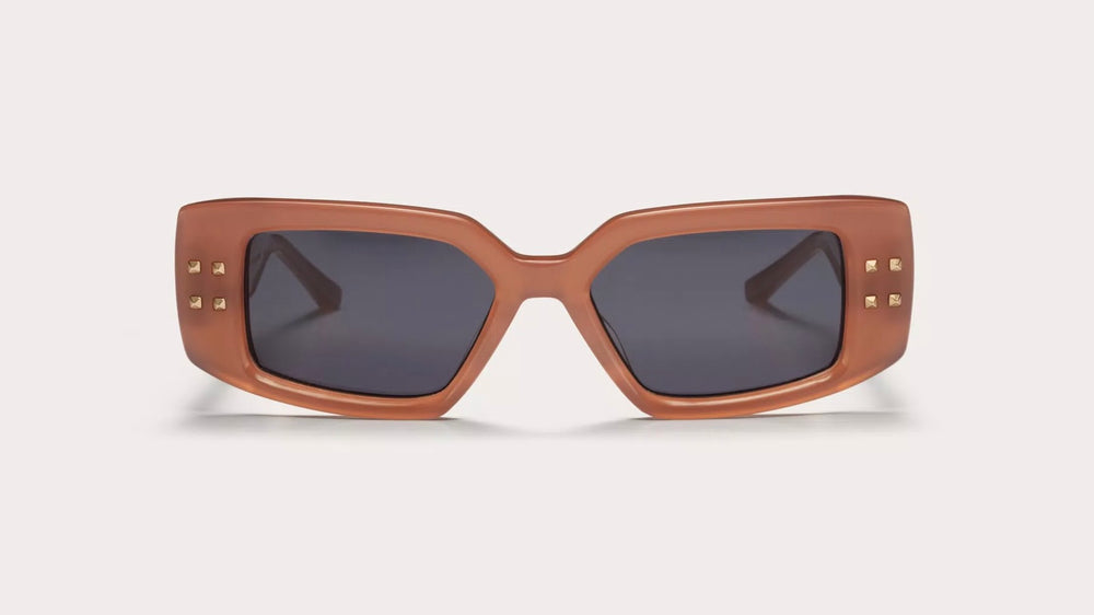 Retro-inspired rectangular sunglasses featuring a bold, chunky acetate frame in a warm bronze/brown hue. The design incorporates distinctive gold stud details on both temples, adding an edgy yet luxurious touch. The dark grey lenses provide excellent sun protection while maintaining a sophisticated look. The sunglasses showcase clean architectural lines and a statement-making silhouette that embodies both vintage charm and contemporary fashion-forward style. The frames substantial build quality and structural design elements create a bold, confident aesthetic.