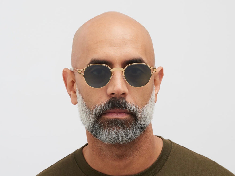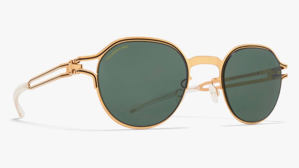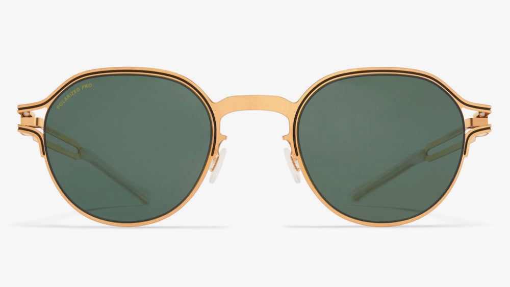 These are elegant round sunglasses featuring a minimalist gold-tone metal frame with a sophisticated design. The frame has a delicate, architectural quality with clean lines and subtle detailing at the temple joints. The green-tinted lenses are perfectly circular and appear to be polarized. The overall aesthetic is modern yet timeless, with slim nose pads and sleek temple arms that create a refined, lightweight appearance. The construction shows excellent attention to detail with precise metalwork throughout.