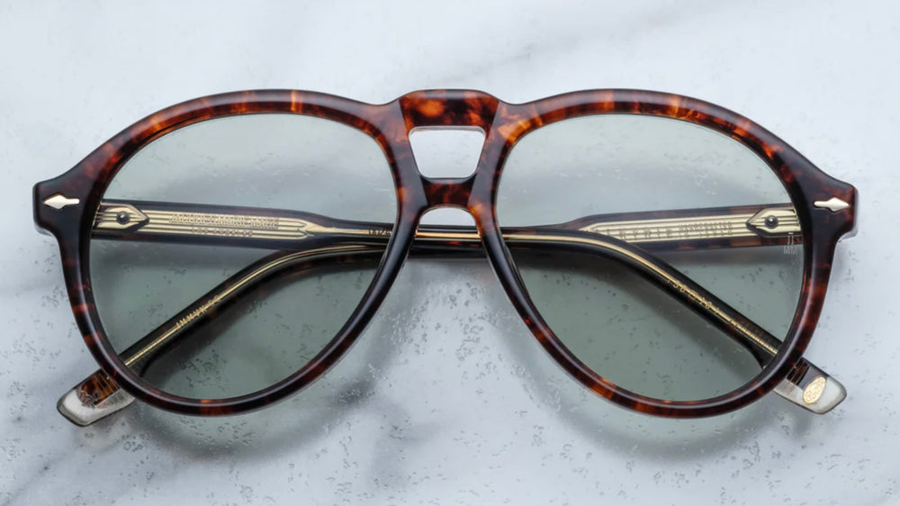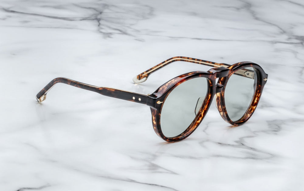 These sophisticated round-framed glasses feature a rich tortoiseshell acetate frame with elegant gold metal temple arms adorned with distinctive Art Deco-inspired detailing. The frame has a classic vintage-inspired silhouette with a substantial build, featuring a pronounced brow line and a smooth saddle bridge. The combination of tortoiseshell pattern and metallic accents creates a luxurious, timeless aesthetic suitable for discerning wearers.