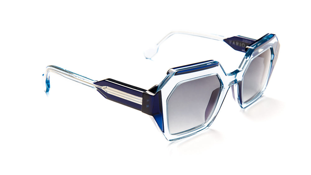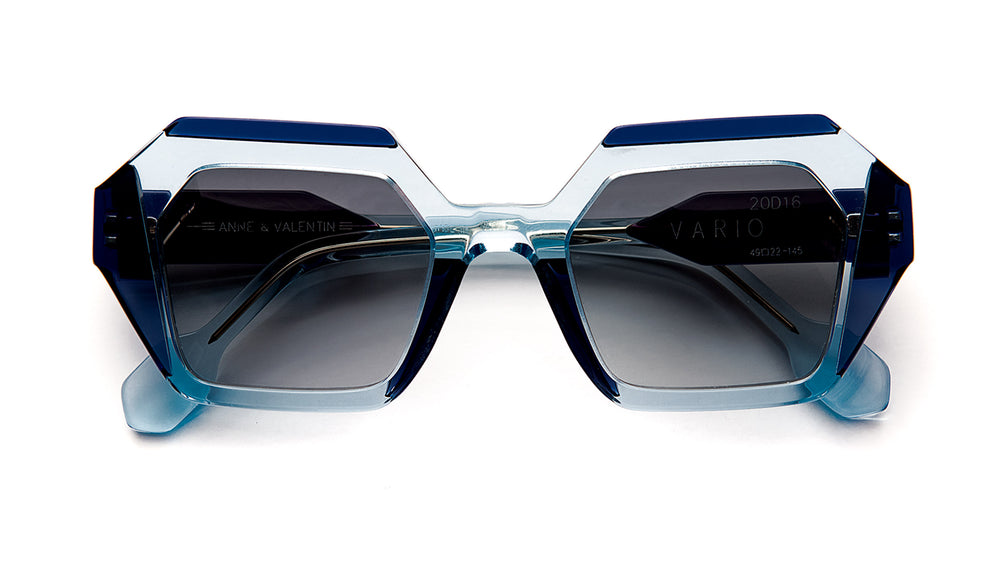 These striking geometric sunglasses feature an avant-garde angular hexagonal shape with a bold two-tone colorway transitioning from deep navy blue to a translucent light blue. The frames are substantial and architectural in design, with sharp angles and clean lines creating a dramatic, fashion-forward aesthetic. The gradient lenses add sophistication while the chunky temple arms balance the bold front design. The overall aesthetic is both luxurious and artistic, typical of Anne et Valentins distinctive design approach.