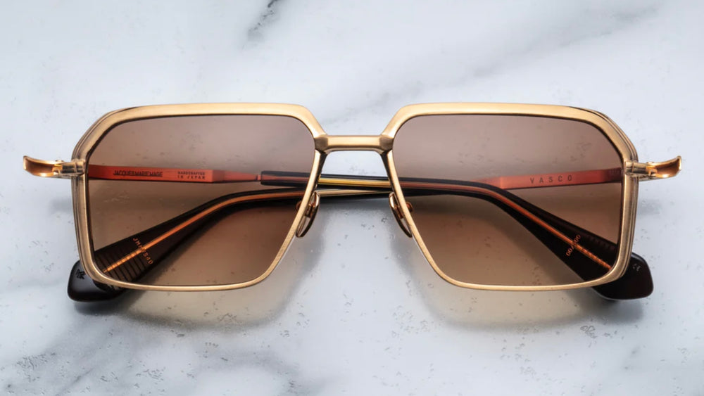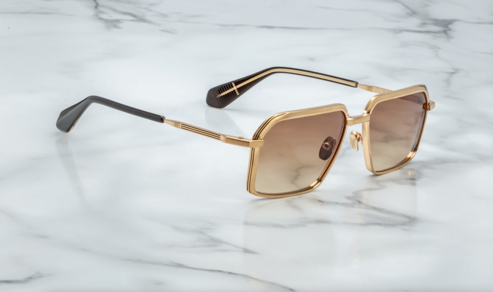 Sophisticated geometric-shaped sunglasses with a luxurious gold-tone metal frame. Features clean architectural lines and a modern, angular silhouette. The brown gradient lenses complement the metallic finish, creating an elegant contrast. The design showcases refined craftsmanship with precise detailing around the lens frames and temples. The sunglasses have a contemporary yet timeless aesthetic that would appeal to those seeking a high-end, fashion-forward accessory.
